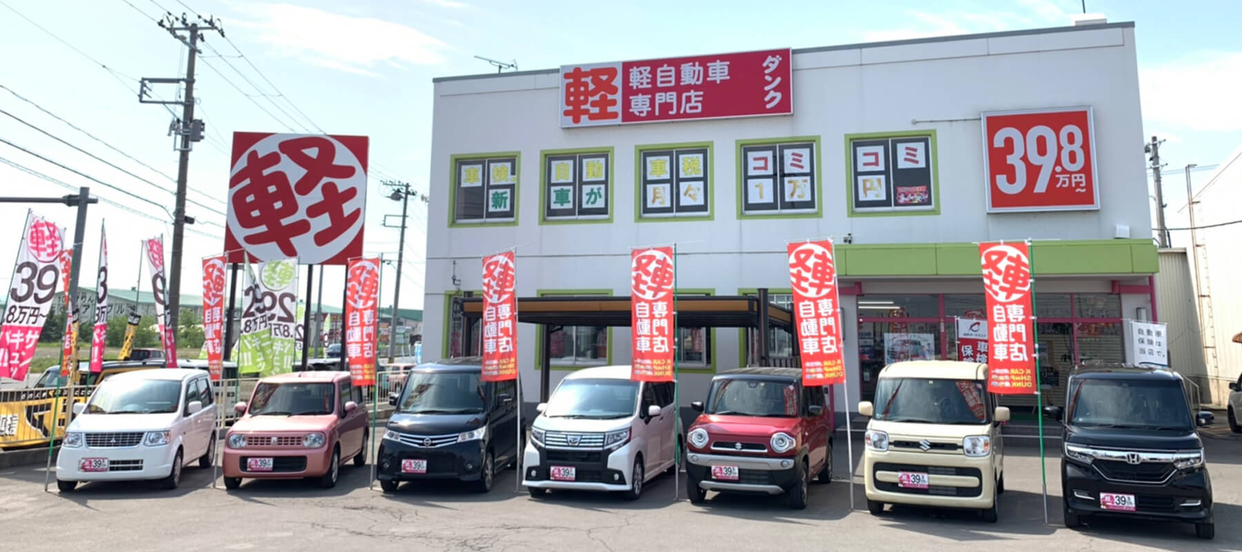 軽自動車専門店ダンクは創業26年、県下最大級のオールメーカー取扱い中古車店です。年間販売台数は新車・中古車合わせて700台!青森県で長く愛されている、地域密着のクルマ屋さんです。